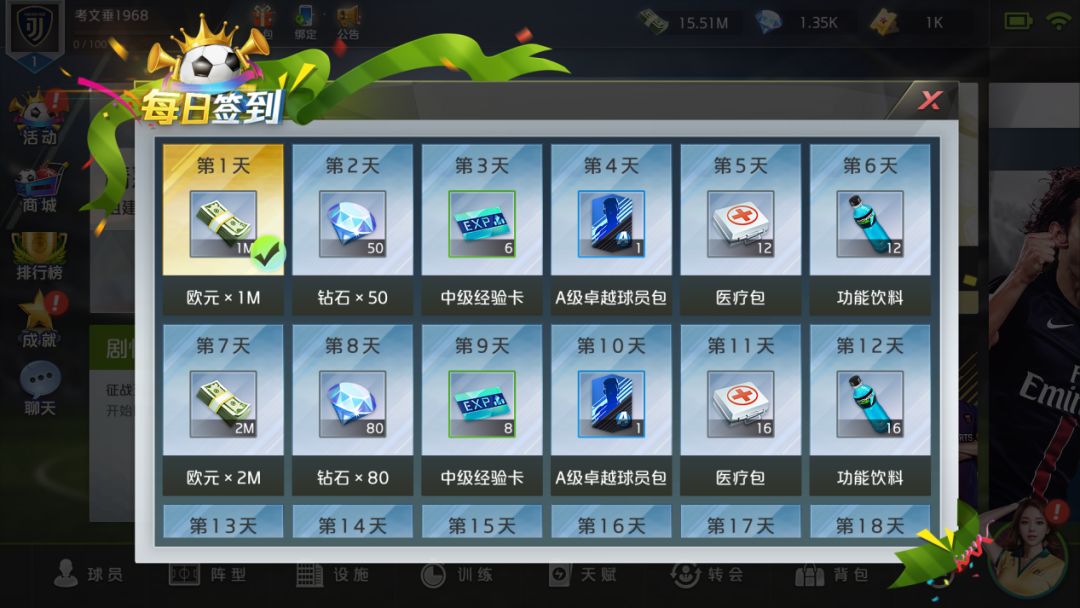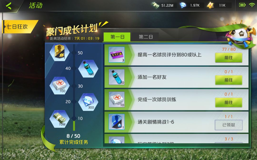 同时,测试期间,完成七日豪门成长计划、达成每日签到,即可获得游戏为球迷们准备的专属福利。点券、钻石、功能道具等资源福利拿到手软,为你的梦幻阵容尽添无限火力。