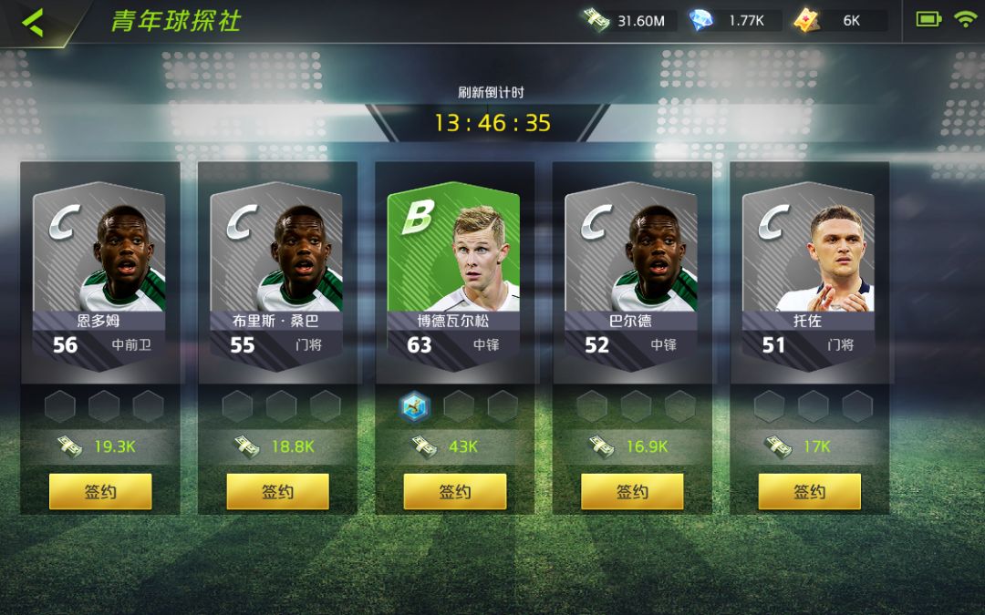 进入青年球探社,可在刷新时间内挑适合球队发展的选新鲜血液。对其升级,既可缩短球员刷新时间,又能提到可签约球员的数量与质量。