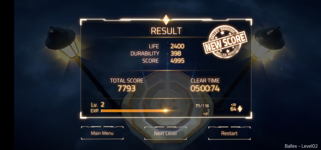 此处是结果,从上到下分别是你剩余的命的分数,第二个不清楚,第三个是你撞击红球获得的分数。下面左边是总分,右边是通关时间再下面是你的等级和经验条,暂时不知道有什么用。(以上都是直接摸索出来,未经过翻译,若有翻译大佬还请纠正)三种光团作用:蓝色:加一条命绿色:回满血红色:加分(没错,是加分而不是扣血,我一直以为它是有害球)