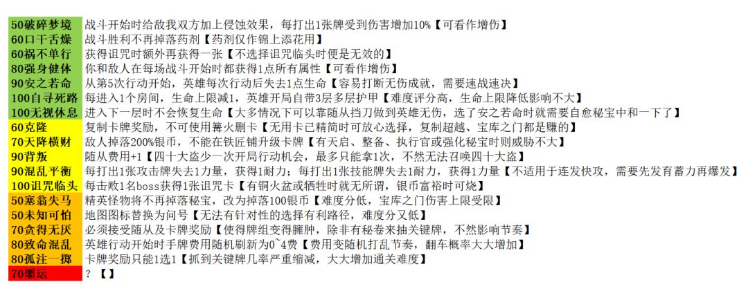 说明一下,我目前只统计了17种难度,还有一种叫“噩运”什么的一直没刷出来,也实在回忆不起来具体效果是啥,希望大家知情的回帖补充一下,然后【】里的分析内容是从自己最常用的“小红帽+变化权杖+四十大盗”组合出发的,50~100表示的是结算难度分,填涂绿色的表示我可以放心选择的,黄色表示我需要仔细斟酌一下的,橙色表示我要尽量避开不选的,希望给大家做个参考,欢迎玩家朋友回帖讨论~