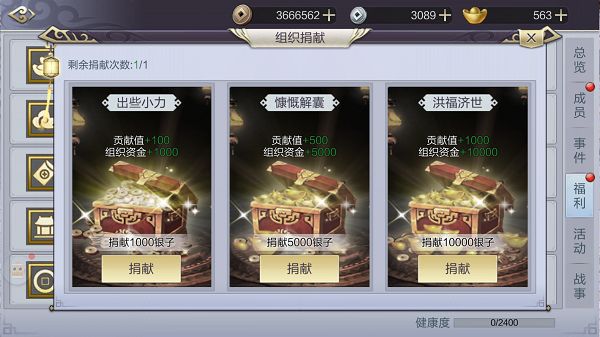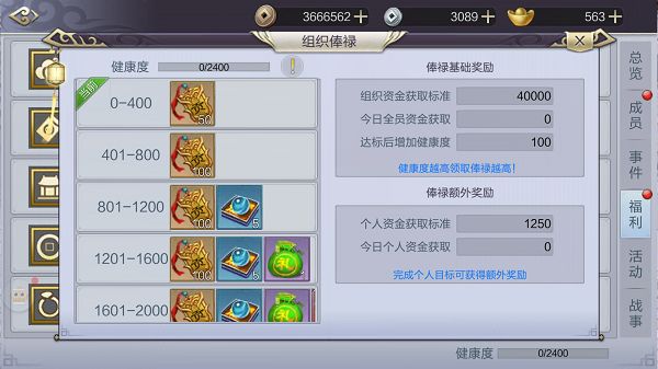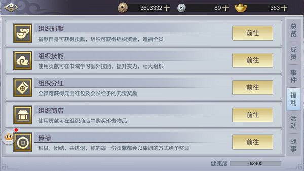 加入组织并不意味一直都是打打杀杀,一直都在付出,组织福利功能会根据每个成员的付出给予相应的回报。组织捐献、组织技能、组织分红、组织商店、俸禄、组织秘宝,这六大功能就是组织为每一位成员带来的福利,组织越健康得到福利的也就越多。