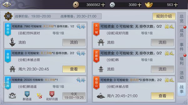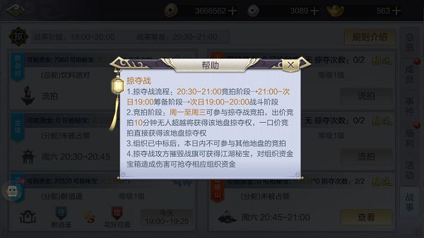 组织在赢得势力战占领相应领地后,并不是就此高枕无忧,因为除了每周两次的势力战之外,每周一至周三还会进行组织掠夺战。组织会长可以在周一至周三的20:30-21:00参与掠夺战的竞拍,竞拍成功后将会在周二至周四的19:00-20:00参与战斗。