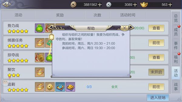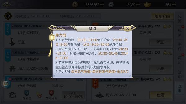在加入组织后,玩家不可避免的会被卷入组织间的争斗中,而组织势力战就是专门为组织争斗而搭建的一个舞台。组织的会长可以在周五、周六的20:30-21:00参与组织领地的竞拍,竞拍成功后将会在周六周日的19:30-20:00参与战斗。