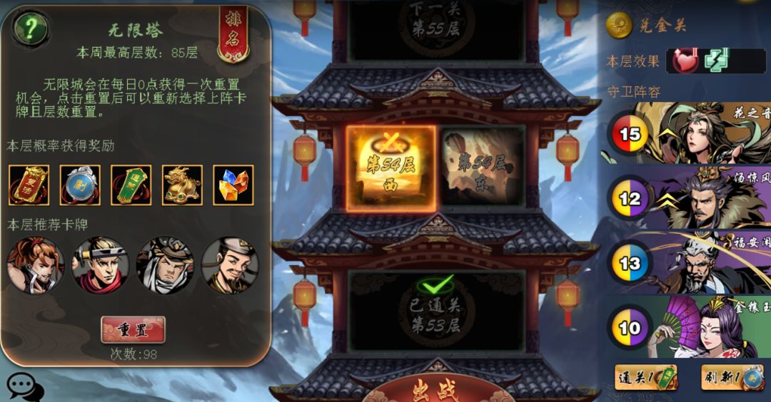 重置:每天增加1次重置机会,最多可以保留1次重置机会。重置后所有无限塔道具(令牌、同心印)、楼层数、卡牌状态都回到最初状态。周一0点强制重置。