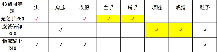 红色打钩的代表我们43级需要鉴定出来的套装部件,红色打钩黄底是指在43级这4个部位有且只有一种鉴定可能,并且是我们需要的。那么我们如果需要在43鉴定就重点把这四个部件需要的数量鉴定出来!