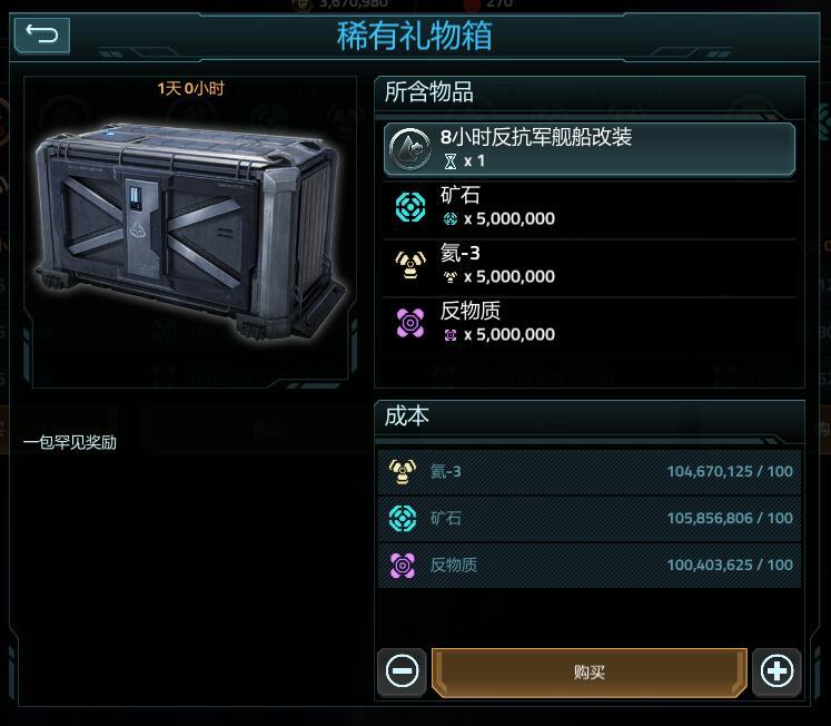 第三天(1月11日)8小时反抗军舰船改装时间代币X1、反物质X500W、氦-3X 500W、矿石X500W。