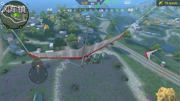 首先,我们得看看飞行路线,一般的路线都离风车镇相差不远的,我们标记风车镇,等到飞机到达差不多位置后,点击离开飞机,左手转动方向对准风车镇方向,右手左右观察视野,观察四周我们的对手都是什么位置和意图,飞行即将到达风车镇的时候,我需要强调下,必须左右拉一下右上角小眼睛的视野,观察四周情况,避免我们一落地就被人家盯上,遭受他人攻击。