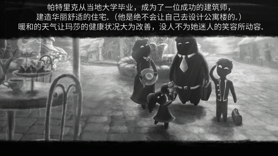 画面方面,这款游戏用的是黑色风格的卡通形象来描绘人物和场景的,胖乎乎的人们和阴暗灰色的建筑,永远没有太阳的天空,以及潮湿的街道,都完美衬托出剧情上反乌托邦的那种阴暗感。人物方面只用了黑色和白色两种颜色,简洁的轮廓让人很好的分辨出谁是谁,表情方面很生动,仅仅只是用了白色勾勒出眼睛和嘴,却能很好的展现一个人的面部表情。但是,这款游戏的画面说不上好,细节方面还是有点不到位的,有些地方过于粗糙,整体上偏朴素,没有那种浮夸做作的感觉,这是一款不依靠外表叫卖的游戏,它真正可贵的是剧情。