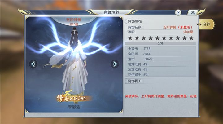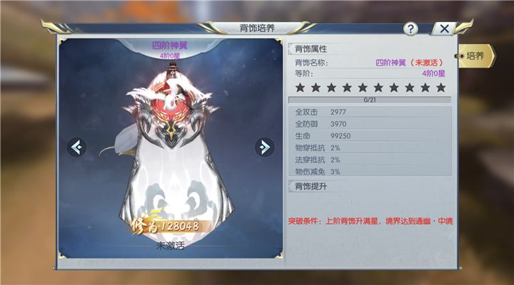 四阶的神翼是尊贵而亮眼的白色,背后的花纹中央嵌着一只振翅欲飞的仙鹤,下方是银色如羽状的花纹装饰,让整件背饰有了仙气和灵气,背饰的主体是白色的绸缎,在两侧有着金属的装饰做支撑,下边有着灰色的暗纹装饰,既简单又华美。这件神翼居然可以增加道友十二万的修为!是不是很令人心动呢?