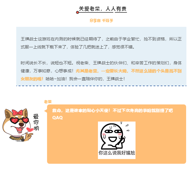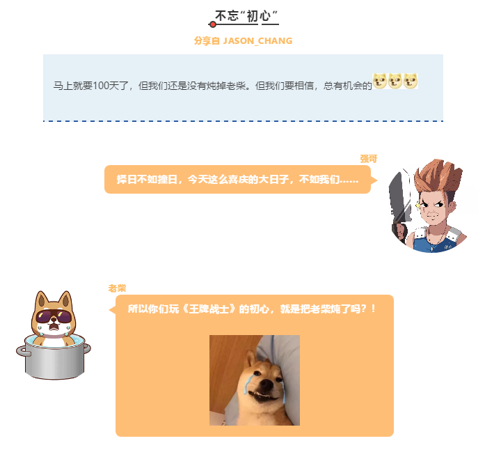 2.不知不觉王牌已经100天了!虽然我是个枪战渣,但是王牌真的太好玩了,人菜还爱玩就是我了。希望王牌战士越来越好!把柴吉养得白白胖胖的!