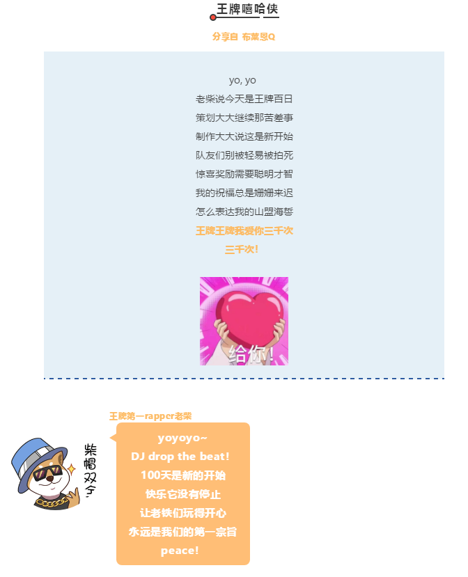 3.今天是一百天,我希望王牌越来越火,越来越好玩。还有我只想对我的队友说:你们多坑我都不嫌弃!