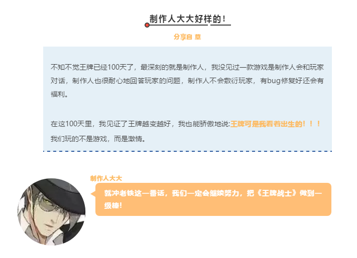 1.策划大人,你要加油哦,美术师大人你也要加油,以后为我们设计更多的皮肤!在王牌战士百日之际祝你们身体健康,万事如意,加油。