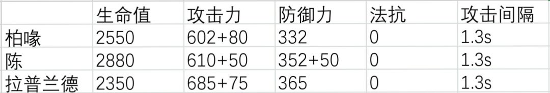生命标准水平,攻击力由于特性是连续攻击两次所以偏低,但普攻DPS在对600甲敌人时仍能保持与常规近卫同一水准,防御力偏低,所以练度低时正面作战有一定生存压力