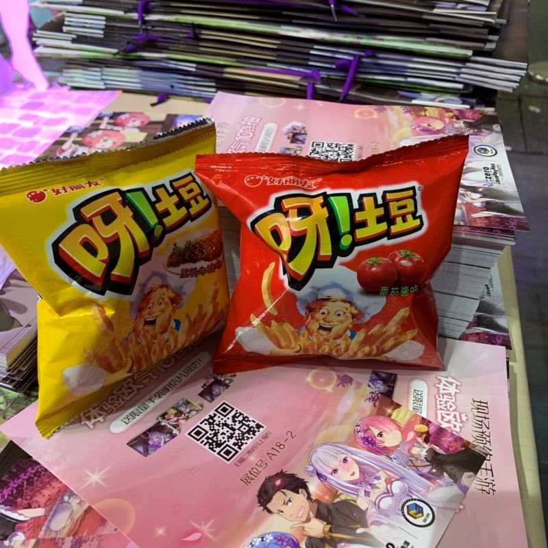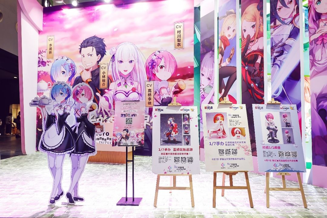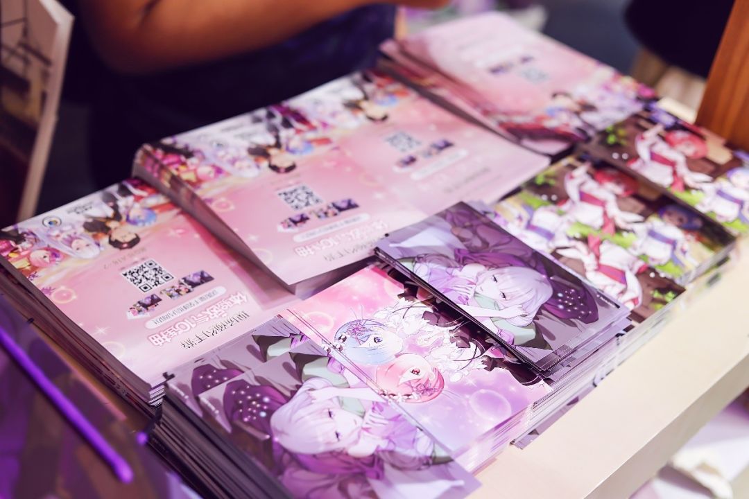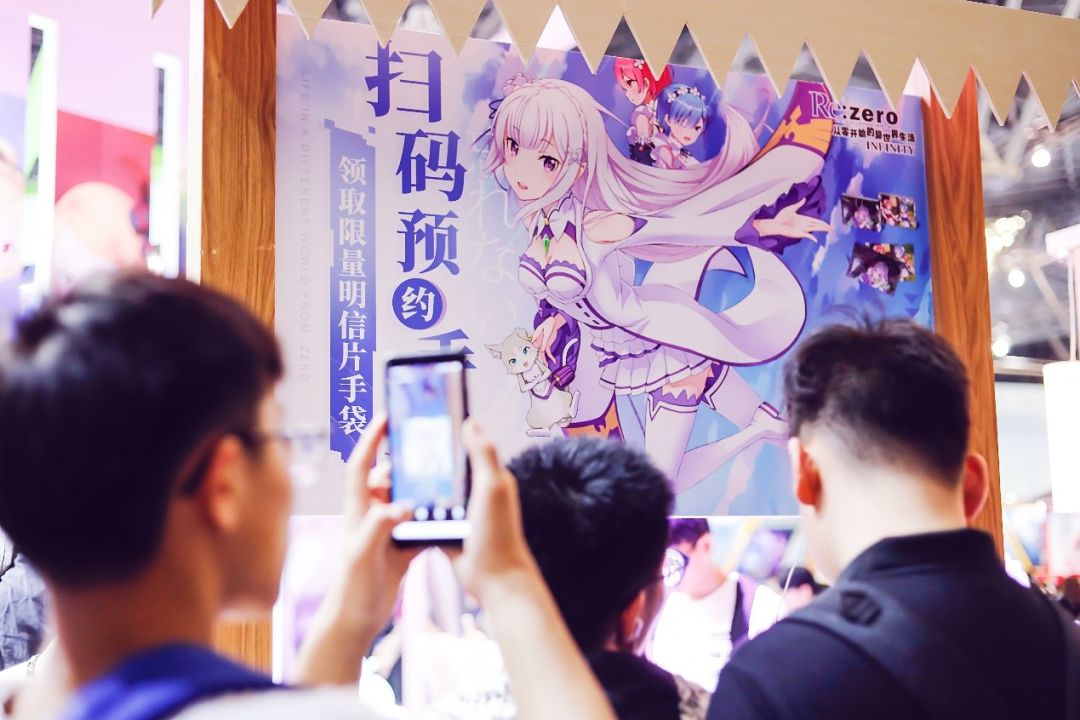 以爱蜜莉雅、雷姆拉姆等动画角色为主题制作的限定明信片,手袋吸引着更多的游客前来预约,陆续在展台前排起了长长队伍。