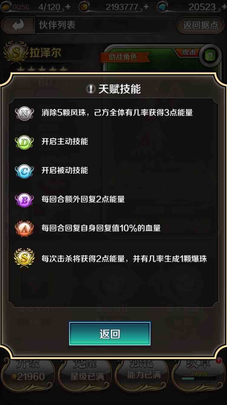 我们先来看看他的天赋和技能——是不是很强力?被动技能和天赋能几率给自己和队友增加大量能量,是目前增加能量值最大的角色,这里顺便说一下排他后面的可以回复队友能量的角色,分别是火系弓手哈尔迪,他的B级天赋为使用技能后给全队增加6点能量,水神艾米莉娅S级天赋全队开场减少2点能量上限和3点能量,地系法师艾琳,她的天赋连5地珠固定回复1点能量,10地珠几率再回复1能量,被动技能几率减少全队能量上限,然后还有一些是固定XX回合回复XX能量,几率回复本系队友XX能量的角色这里就不一一赘述了。然后,他的主动技能是消除敌方增益buff再降30防御!有没有很无敌?所以,拉泽尔可以号称是目前第一万金油角色了!估计以后也会是第一,毕竟作为巅峰神卡的水神回复的能量也没有他多。因此战斗能力拉泽尔可以够得上S+的评价了!但是!目前因为没有比较有难度的副本,为了追求速度,风系的位置一般都带风神或者蕾等有攻击增益的更强输出卡牌,或者再次一等的倾城等卡牌,毕竟拉泽尔的攻击只是他的面板攻击,没有增加自身攻击的增益buff,而且现在运营也有意增加角色的能量回复速度,战斗时各角色的能量回复速度都已经很快了。现在一般都用不到需要加快全队能量回复速度的拉泽尔了,但是相信未来再开更高难度副本的时候就有拉泽尔的用武之地了。遥想当年(其实也就几个月前……)还没开放精灵和纹章系统,以及没有水神的时候,那时候速通50红本的组合就有一种艾琳,玲珑,拉泽尔,哈尔迪的极速技能回复流的组合,基本2回合就是一波技能轰炸!因此,就目前的情况,拉泽尔在组队副本暂时还处于一个可有可无的位置,我这里给他的战斗能力评价再降一个档次,给他S评价!关于获取难度,我上面说了,拉泽尔可以说是获取难度比较高的角色之一!因为目前除了水神(只有商店或者抽卡有极低!几率!刷出碎片),土神(只有每周讨伐得到的4−6级繁荣宝箱有极低!几率!开出碎片或者整卡)外,就属拉泽尔最难获取了。因为除了新手活动期的累计充值可以快速获得拉泽尔碎片外,就只有第4商店偶尔会刷出拉泽尔碎片了,商店购买碎片算是拉泽尔最稳定的获取途径了。此外,钻石抽卡里是没!有!拉!泽!尔!整!卡!的!但是据说貌似有极低!几率!抽出个把碎片,反正我玩了将近一年,每周固定的十连抽里是没见过一片!碎片!我的拉泽尔大部分碎片都是每天固定2小时一刷的第4商店里买的,整卡是当时新手期累积充值给的碎片召唤的。因此,拉泽尔的获取难度我给他打S。