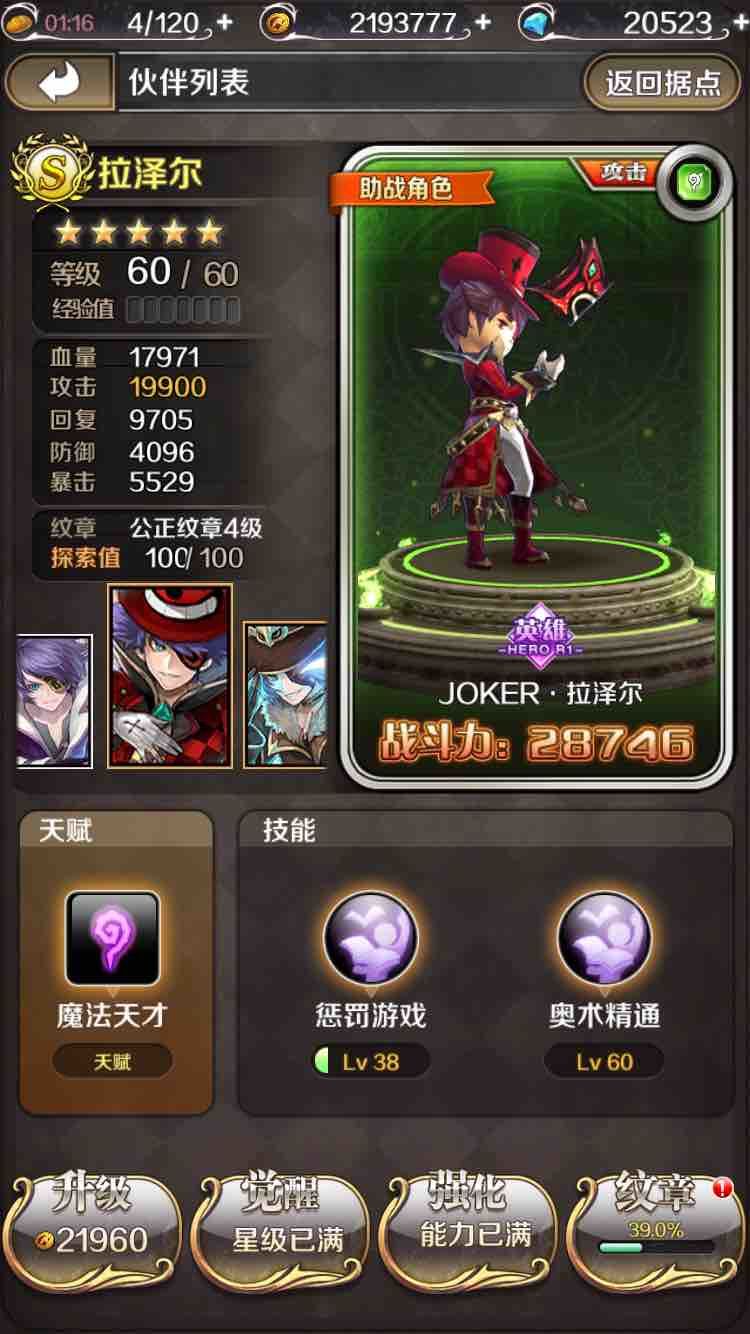 再来说说拉泽尔纹章的搭配吧,大家看到了,拉泽尔纹章界面最下方的魔石孔1,2,4,5都是辅助性的圆形方形魔石孔,就只有第3魔石孔是攻击性的三角魔石孔,因此拉泽尔其实应该算是辅助系角色,我是不知道游戏策划硬要在角色属性界面的人物造型框右上角给他标一个攻击干嘛,明明就是辅助系嘛……废话不多说,圆形魔石孔是防御性的,我给他第一孔配的是减伤魔石,第4孔虽说不知道猴年马月能激活,但是不出意外最好给他配增加防御的魔石,第2孔是辅助性孔,有几率眩晕,几率清除敌方buff,百分比破甲,几率普攻产生属性珠,开场增加能量等等属性,我个人给他配了几率清除本队debuff的魔石,让他成为一个全能型角色吧!但是如果以后出pvp模式的话,最好还是配个开场减能量的魔石,因为个人目测出了pvp系统,还是谁先释放技能,谁就占优。最后说说唯一最需要拉泽尔的情况吧,就是公会每周的boss讨伐战,因为讨伐战是第三回合结束必定团灭的模式,因此第三回合前能放一波技能就能大大增加输出,因此目前讨伐输出最高的组合是风系为主的纯色队,拉泽尔,风神或者蕾,风核罗宾,然后再加个可以减能量的水神,妥妥前三回合就能放技能,而且罗宾开了技能增加大量风珠,用这个组合基本输出排名前三没跑了!虽然我是唯一一个5星拉泽尔,但是因为攻击都没上2W,我还真不好意思说我就稳坐第一拉泽尔的位置了,总之同志还需努力,我还有为之奋斗的目标!希望你们能一起加入我们诺文玩家的行列!不久后的安卓玩友们,期待你们一起加入进来,一起走下去!