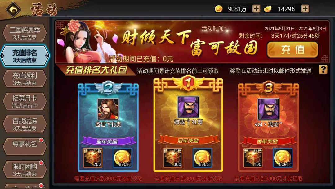端午节活动期间(6.11-6.14)玩家充值满3000元人民币,且服务器排名前三位,即可获得珍稀道具奖励,有需求的玩家切勿错过哦!