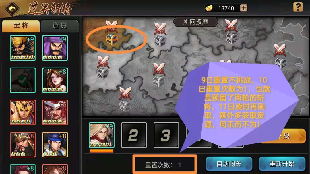 而过关斩将是唯一可以活用规则预留2次挑战机会的副本,具体操作如下:本次过关斩将双倍开始时间是6月11日,那么从6月9日重置次数为“1”时开始预留,9日当天点击“重新开始”,此时重置次数显示为“0”,手动打一小关但不要领奖励宝箱,到了6月10日,重置次数增加为“1”,这样等到6月11日零时再挑战过关斩将,有两次预留下来的机会,而且都是双倍奖励,但必须在11日凌晨3点系统更新前挑战完毕,这也是巧用规则额外最大化获取游戏收益。