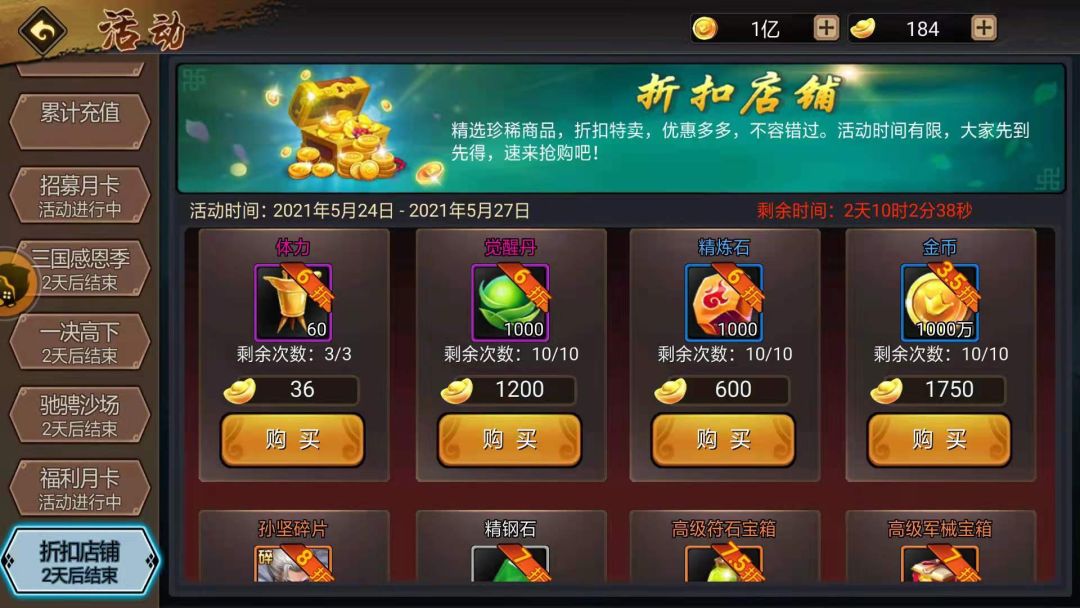 折扣商店是继本次团购特惠后,玩家优惠购买其它珍惜道具和武将碎片的入口。各种热门资源林林总总,也是玩家快速提升战力的惠利选择,其中有皇冠武将碎片贩售,还会有6折体力出售,作为任务发起的源泉,值得购买。同时热门如橙色符石碎片和高级符石宝箱也是众多玩家的选择,特别是高等级橙色符石的养成所需符石碎片数量之多,所带来的战力和属性的提升,都是玩家迫切需要的。而高端玩家对于极品符石的趋之若鹜,高级符石宝箱也是获取极品符石最直观的方式,必出稀有或极品符石,在战力和属性的提升上更胜一筹;其它如精炼石、觉醒丹、金币、战魂碎片、战魂经验等资源,大家可以酌情购买。