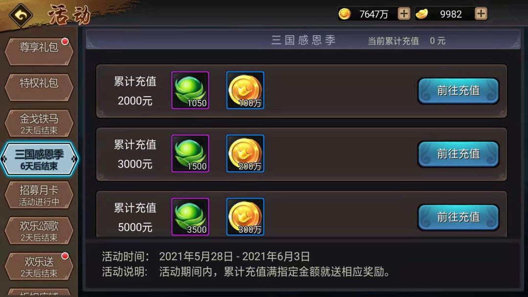 此次活动中(6.11-6.17)官方诚意满满回馈多多,玩家累计充值达到指定要求,即可获得珍稀道具或养成材料的奖励,不管是急需快速成长的新区玩家还是处于战力上升瓶颈期的老区玩家,这些资源可以助你再上一个台阶,成就自我,机不可失。
