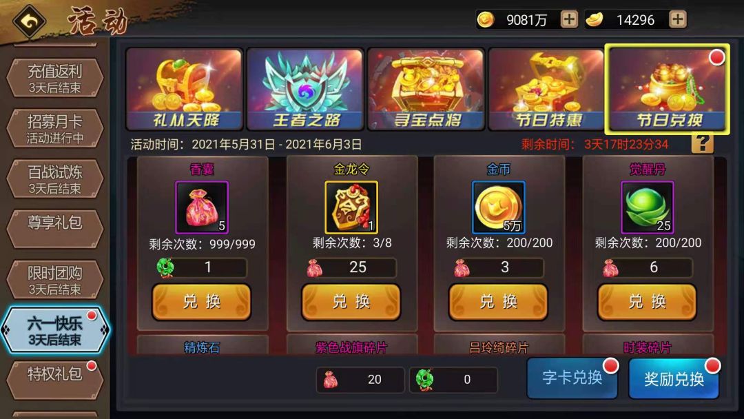 在此次的端午活动中(6.11-6.14)玩家完成普通、精英副本、过关斩将以及战役副本等玩法结算奖励中会额外掉落“粽叶飘香”节日字卡,收集这些字卡后可以在节日兑换环节,兑换指定的珍惜道具资源,比如金币、金龙令、精炼石、突破石、战旗碎片等道具。通过收集节日字卡的方式,既让玩家体验了浓浓节日的氛围,也让大家更为轻松便捷地收获资源。