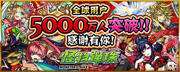 感谢大家对「怪物弹珠」的支持与厚爱!为了纪念在全世界累计用户已达到5000万人,特别推出「5000万人下载突破纪念活动」!