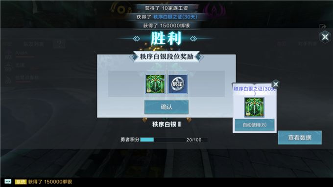 在宝箱奖励之外,3V3排位赛每月为一赛季,每赛季中玩家首次升段成功,并且满足累积胜场次数后,可以获得一个对应的配饰奖励(限时),以及对应的绑银奖励。玩家晋升的段位越高,奖励的配饰可提升的战力也越高,绑银数量也越多。