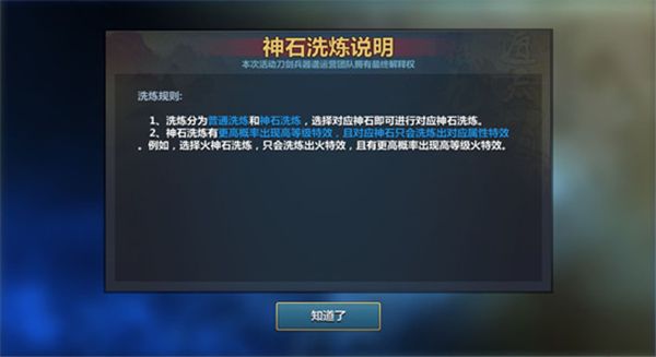 新版本更新后推出神石洗练系统。之后的洗练分为神石洗练和普通洗练,神石洗练需要使用神石,普通洗练和以前的一样。四种对应属性神石,每次洗练需要三颗相同的神石和金币,能洗练出神石对应的特效,而且会有保底的星数,提高出现高星的概率,能节省大量的金币,几十万金币就能出自己想要的七星特效。
