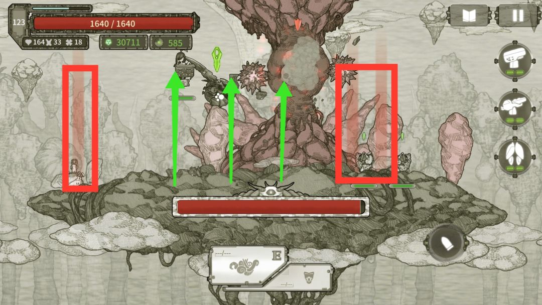 如图,地图上会出现类似红框内的红色光柱,这就表示boss要召唤地刺了,但是地刺召唤好像是无序的,所以偶建议大家向上跳跃(绿色剪头方向),时间自己多试试把握哦( d(ŐдŐ๑)楼主为了截图死了几次就没有细测,偷个懒),不过如果在地面上有boss召唤残留的石块时,我们也可以站在上面躲避(建议还是进行跳跃)