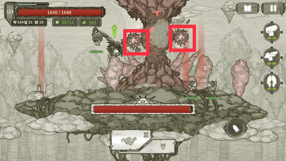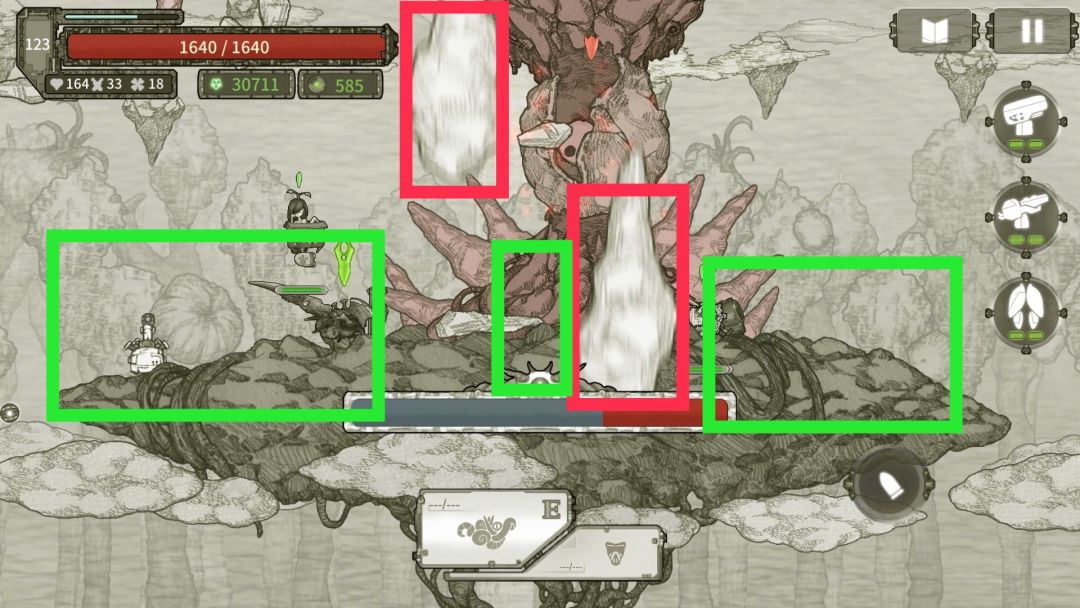 如图会从屏幕底部飞出类似红框内的石头若干,这时候我们只要站在例如途中的绿色区域就可以啦(要看准石头从底部什么位置飞上来的,我们就躲空隙间)