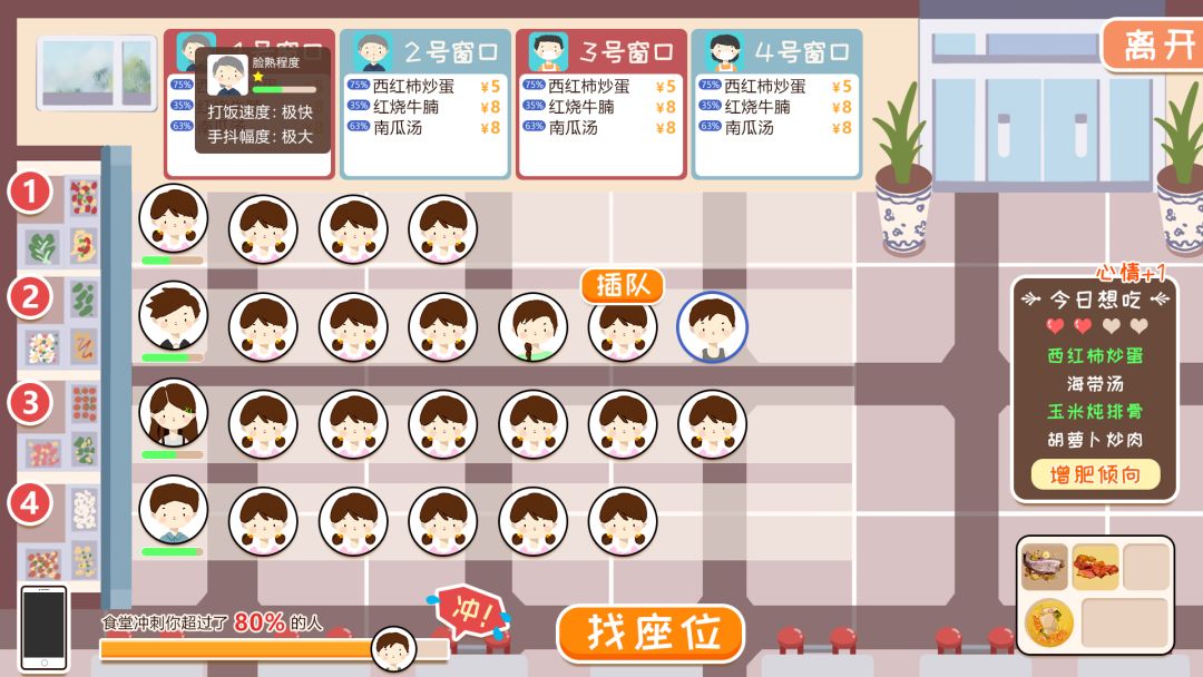 二、排队阶段你可以选择任意窗口进行排队(插队或者搭讪也可以只要你不怕被打),不同的窗口有不同的打菜员和菜品,每个打菜员都有其固有的特点,比如说一号大妈就是打饭很快,但是抖得也很多,but,你跟打菜员的面熟等级会给与其一个加成,减少手抖程度并且加快打饭速度,所以混食堂也是需要技术的,当然这里你就别想要微信了,人家没空掏手机。