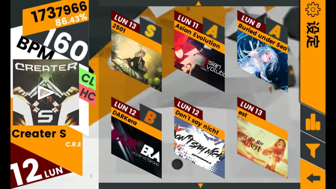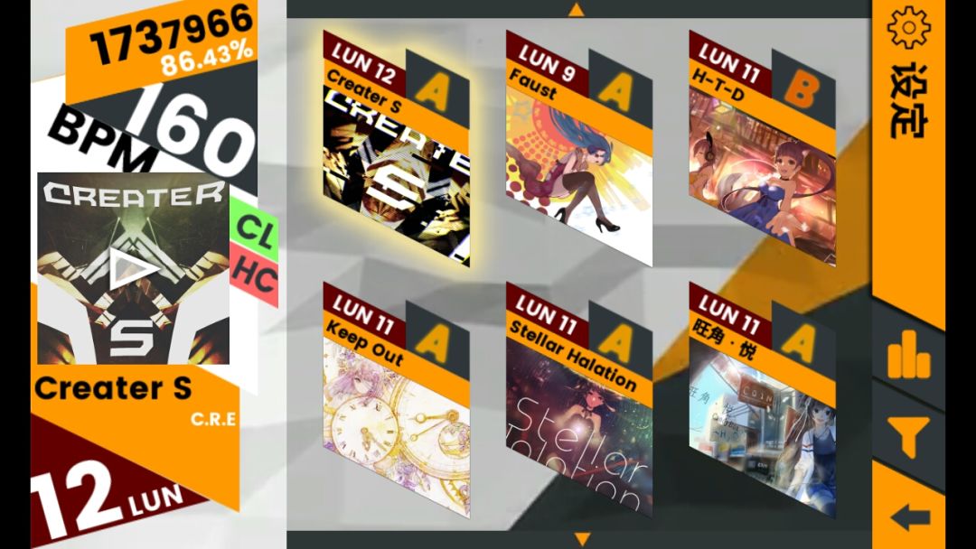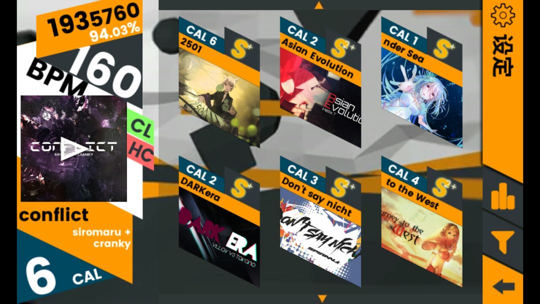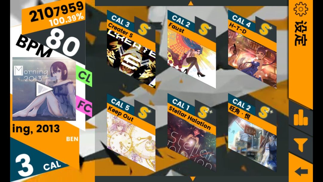 差不多只有几首歌没解锁了,挑战歌曲都解锁了,现在基本上能把已经解锁的歌的CAL难度都打上S+