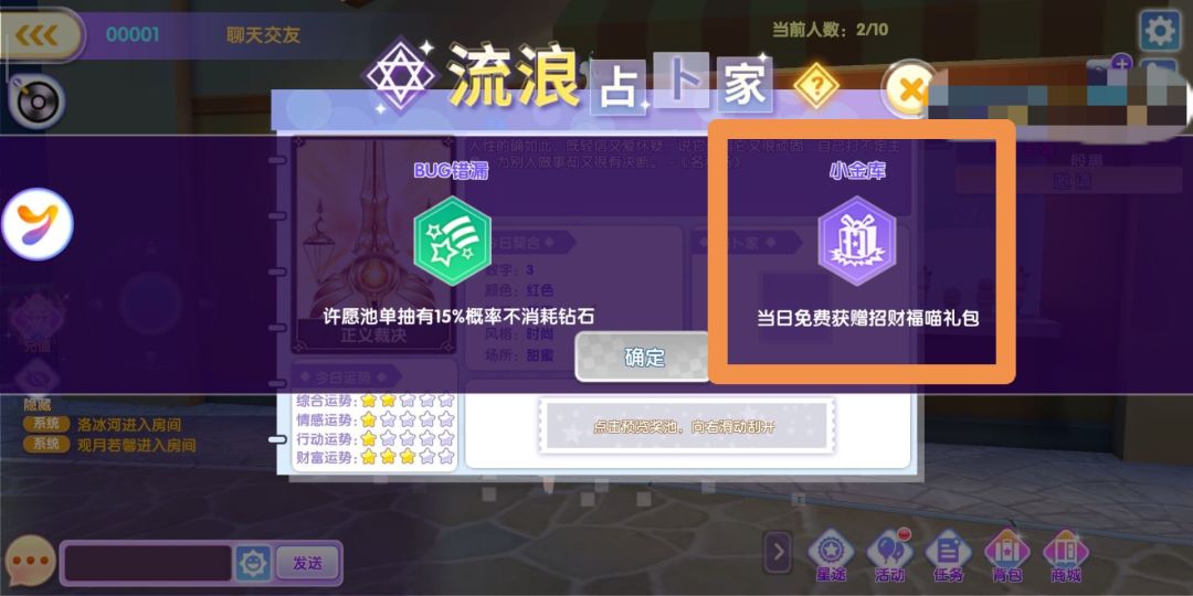 第二个免费得乐钻,就是新版本出来的占卜家,每天可以免费占卜一次,每天也可以得一次福利,而且每天的福利也不一样,运气好了还能抽到招财猫礼袋,里面有120到900的乐钻,运气不好的最低都可以得120乐钻。