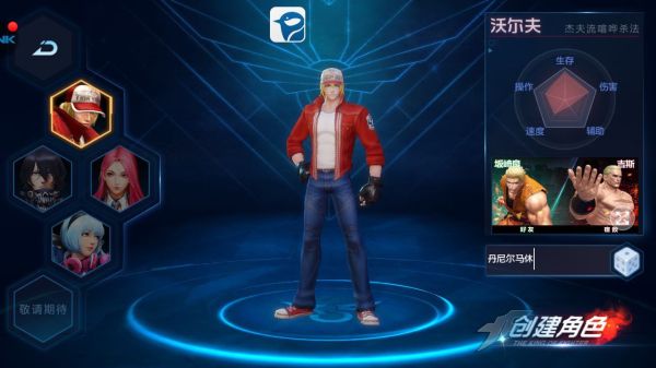 先说沃尔夫,其实沃尔夫就是我们非常熟悉的特瑞,《拳皇世界》四大主角中唯一的原版拳皇角色,据开发同事透漏,特瑞生存能力较强,技能伤害高,但攻击速度较慢,并非敏捷型选手。不过,沃尔夫操作难度中等,非常容易上手。综合来讲,沃尔夫在团队中的综合能力较强,是一个低速近战高伤害的角色。