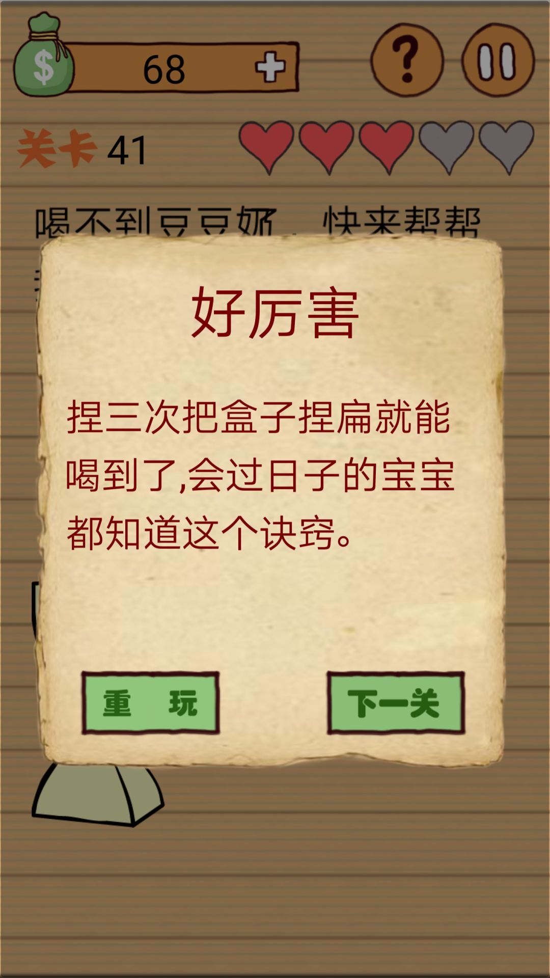 41关,两个手指挤盒子,挤三次。题目那个豆豆奶是没用的。