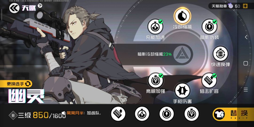 这里我和别的攻略不同,我不推荐点🔫伤害。因为🔫是近战用的,我不认为看这个攻略的人可以做到用手枪开两枪后秒切枪爆头,新手天赋可以点暗影时间,暗影冷却,大招时间。