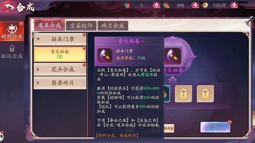 材料合成分3个部分:道具合成、宝石纹印、碎片合成。道具合成可产出副本门票、花卉合成、契兽碎片;宝石纹印可产出固守宝石、攻击宝石;碎片合成可产出武魂。