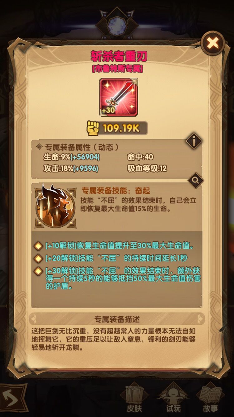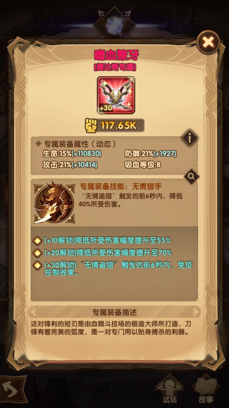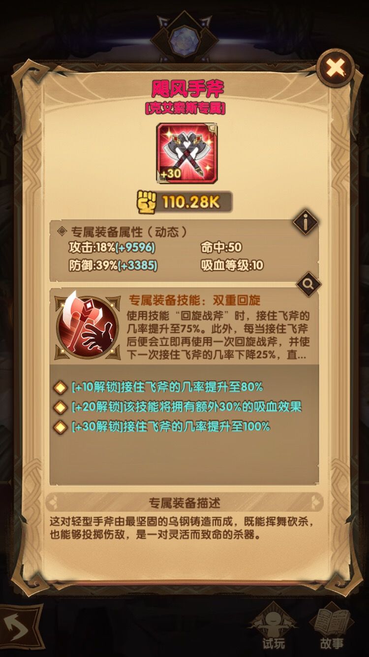1: 双斧(加10会提升5%接到斧头的概率,看似不多,但结合专武开启效果来看,原本4连可能就变成5连,而且双斧被动有团队吸血,迷宫又可以换的到,也算蛮血都会练的一只英雄,如果有资源,值得投资)