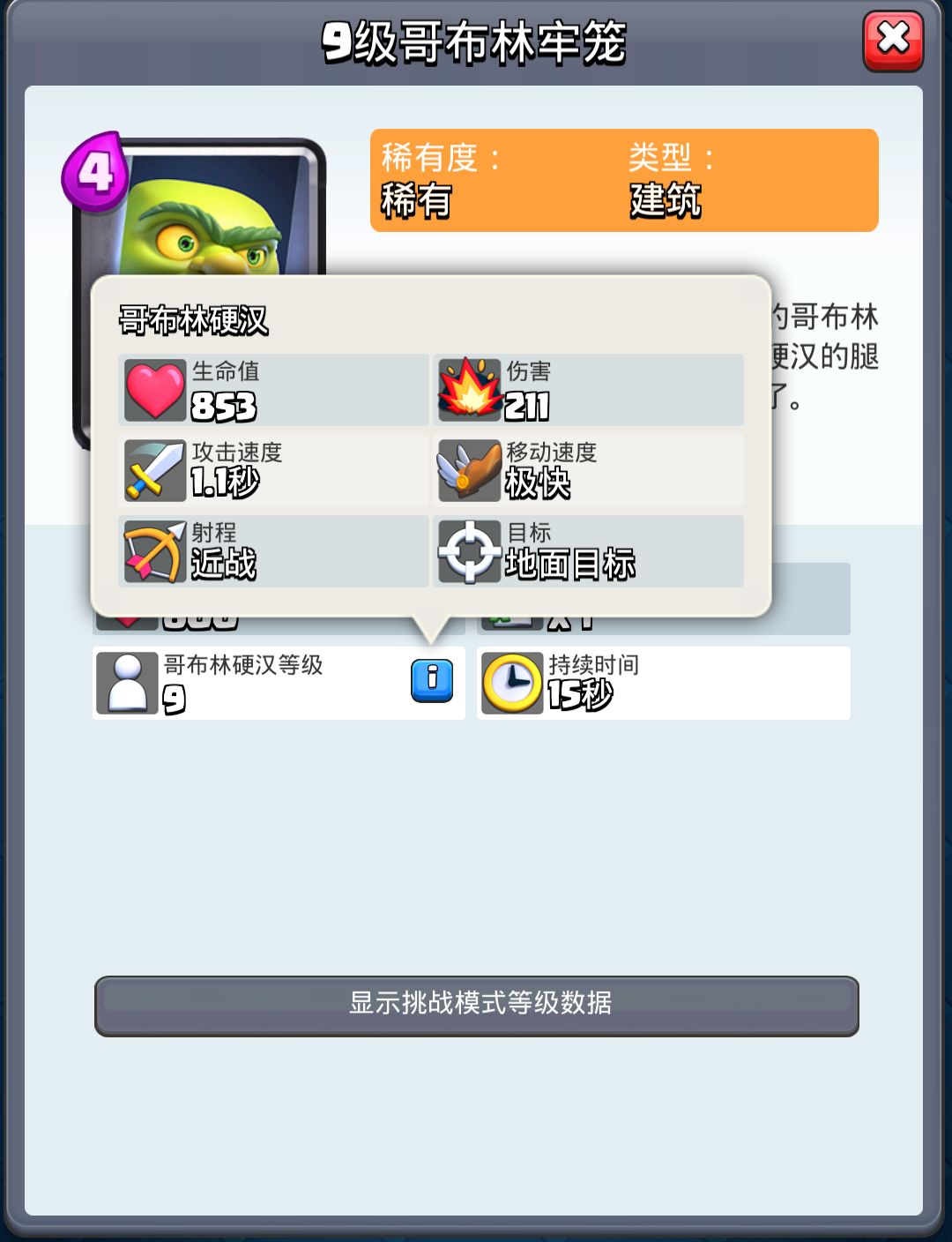 建筑本身4费,九级拥有800的血量,没有攻击能力,只能用于拉扯其他兵种。相比于其他几张建筑卡牌,哥布林牢笼仅比两个三费的建筑(加农炮、骷髅墓碑)高出一点点。