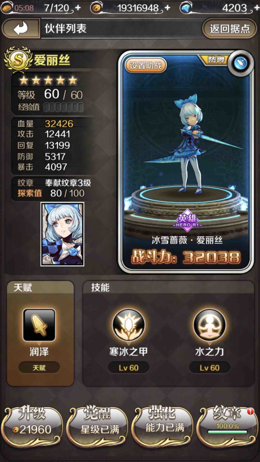 我们再从天赋和技能来看一下这个人物。普通攻击可以获取护盾值,护盾值能够减少伤害。护盾的生成是鉴于人物的面板攻击力和生命值,而犹豫爱丽丝自身攻击属性不高,但血量成长极高,所以每次攻击能生成的护盾值还是很可观的。目前护盾能够减少50%的伤害,所以对于队伍的生存能力是相当有用的。S级天赋后将主动技能生成的水珠变为6颗,可以为护盾的生成提供更多攻击需要的水珠。被动技能满级可以减少7点能量上限,增加5400的血量,当受到群体攻击或者针对爱丽丝的单体攻击时,爱丽丝会回复部分生命值,这个回血量也是相当高的。就拿图中我的爱丽丝来说,每次被攻击后就能回复4100+的血,而且这个回血的数值是和爱丽丝的回复值挂钩的,回复值越高,回血就越多。所以除了自身生命防御成长高之外,爱丽丝的回复也是相当重要防属性。主动技能在原本需要25点能量,但是在被动技能减少7点能量上限的情况下,只需18点就能释放,自身切换成冰霜形态持续3回合,每回合生成6100点护甲,并根据自身攻击和生命值生成额外护甲,这里的额外护甲生成比是1倍攻击力和0.75倍生命,就拿我的爱丽丝来说,每回合约可以生成42861的护甲,是不是相当的给力,大幅度提高队伍的生存能力,可以在血瓶不足回血无力的时候撑一下。爱丽丝不但拉高了队伍的整体血量,还大幅度加强了队伍的防御能力,是目前版本当之无愧的第一防御角色(地神艾瑞拉暂不考虑)。
