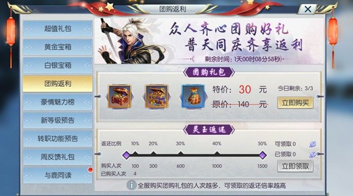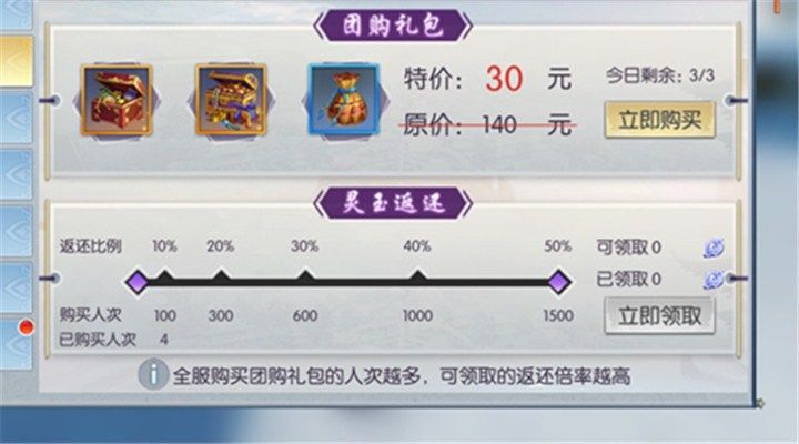 进入游戏,打开左上角人物头像下的精彩活动,在列表里就能够看到我们的团购返利活动了,团购礼包里面包罗了道藏大礼包(内含道藏残页*10,灵气*20)、背饰大礼包(内含灵羽*60,魂晶*2)、四级宝石选择礼包(使用后可以选择任意一个四级宝石)。礼包内含有的道具都是对我们修为提升非常重要的,是我们千万不能错过的。团购礼包原价是140元,而现在只要30元玩家就可以将上面的三个礼包统统带走了,而且每个玩家每天都可以购买三次。