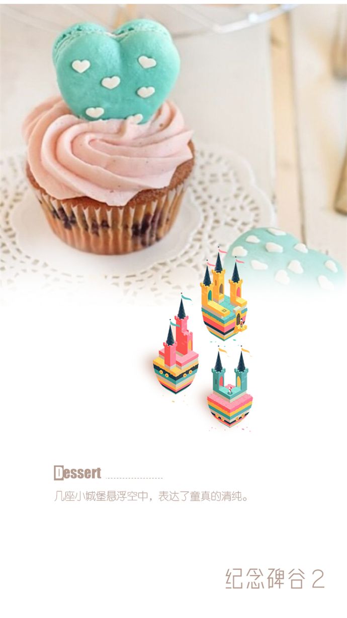色彩鲜艳的甜点错落有致的摆放,让人一眼看上去就觉得甜美,同时也象征了生活的美好与浪漫。《纪念碑谷2》中场景,几座小城堡悬浮空中,整个画面粉色为主,色调非常活泼。表达了童真的清纯与对美好生活的向往。