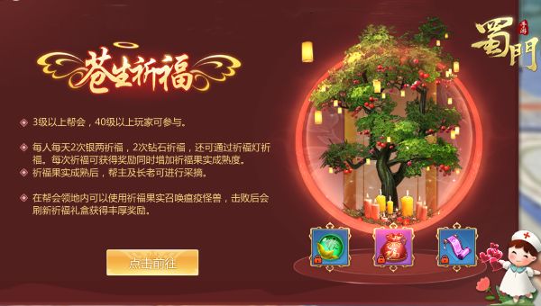 思念和祈祷从来都是一件有力量的事情,为那些遭受着挫折与不幸的献上最美好的祝愿。《蜀门手游》以帮派为单位,在帮派领地内点燃祈福灯,集众人之力击败瘟疫恶魔献上祝愿领取掉落礼包。礼包内包含领悟丹宝石灵石包等惊喜礼品,更有稀有时装等你获得。坎坷挫折总会过去,美好的明天一定会到来。让我们共同祝愿!