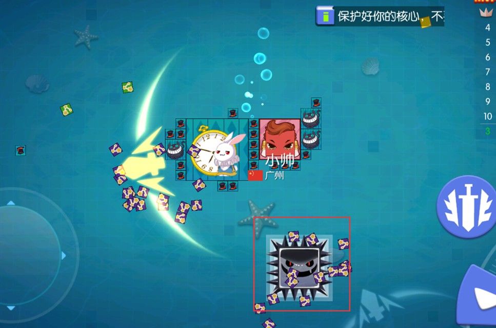 2.擦边碰瓷法:在敌方拥有比较大的方块,但核心方块周围的防御比较少的时候,可以通过旋转自身的角度,把自己最大的方块对准别人的核心方块进行冲撞,做到以小博大