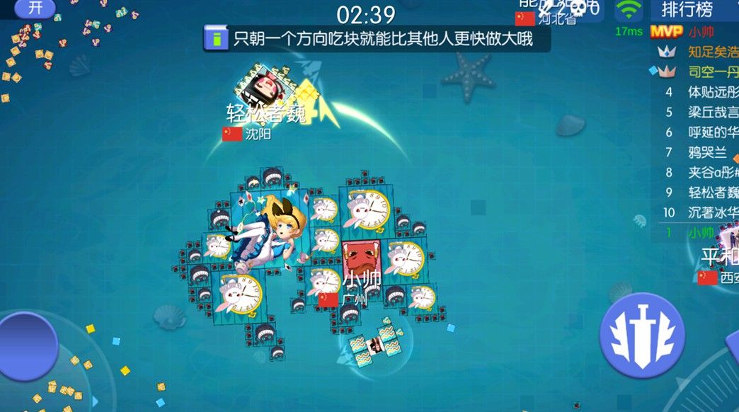 2.祸水东引大法:在被对方追逐,实在无法逃离的情况下,可以寻找比对方更大型的玩家,然后把对方引到更大的玩家那里,一般玩家都会选择撤离,除非他想两败俱伤。