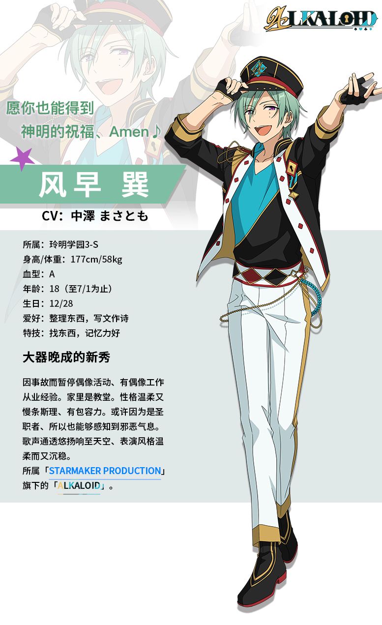 家里是教堂。性格温柔又慢条斯理,有包容力。或许因为是圣职者,所以也能够感知到邪恶气息。歌声通透悠扬响至天空,表演风格温柔而又沉稳。