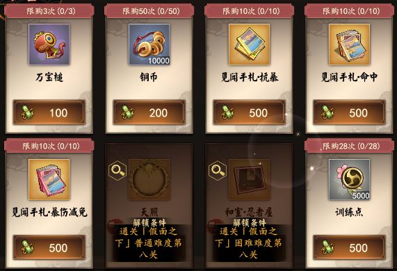 搬空本次商店需要136575个草书,见闻手札需要通关3-20才能兑换。