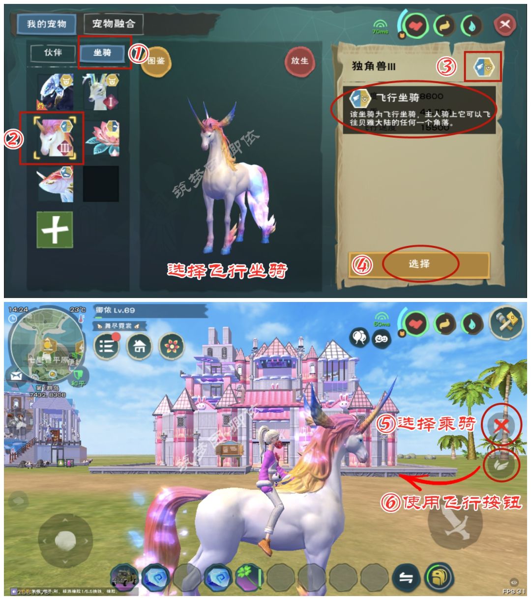 飞行操作流程如下,选择设置中的宠物-坐骑-具体的飞行坐骑头像-选为当前坐骑-回到主界面-选择乘骑,这时候移动就是坐骑陆地奔跑,使用飞行按钮,坐骑就可以帅帅的飞起来,从空中俯视贝雅大陆