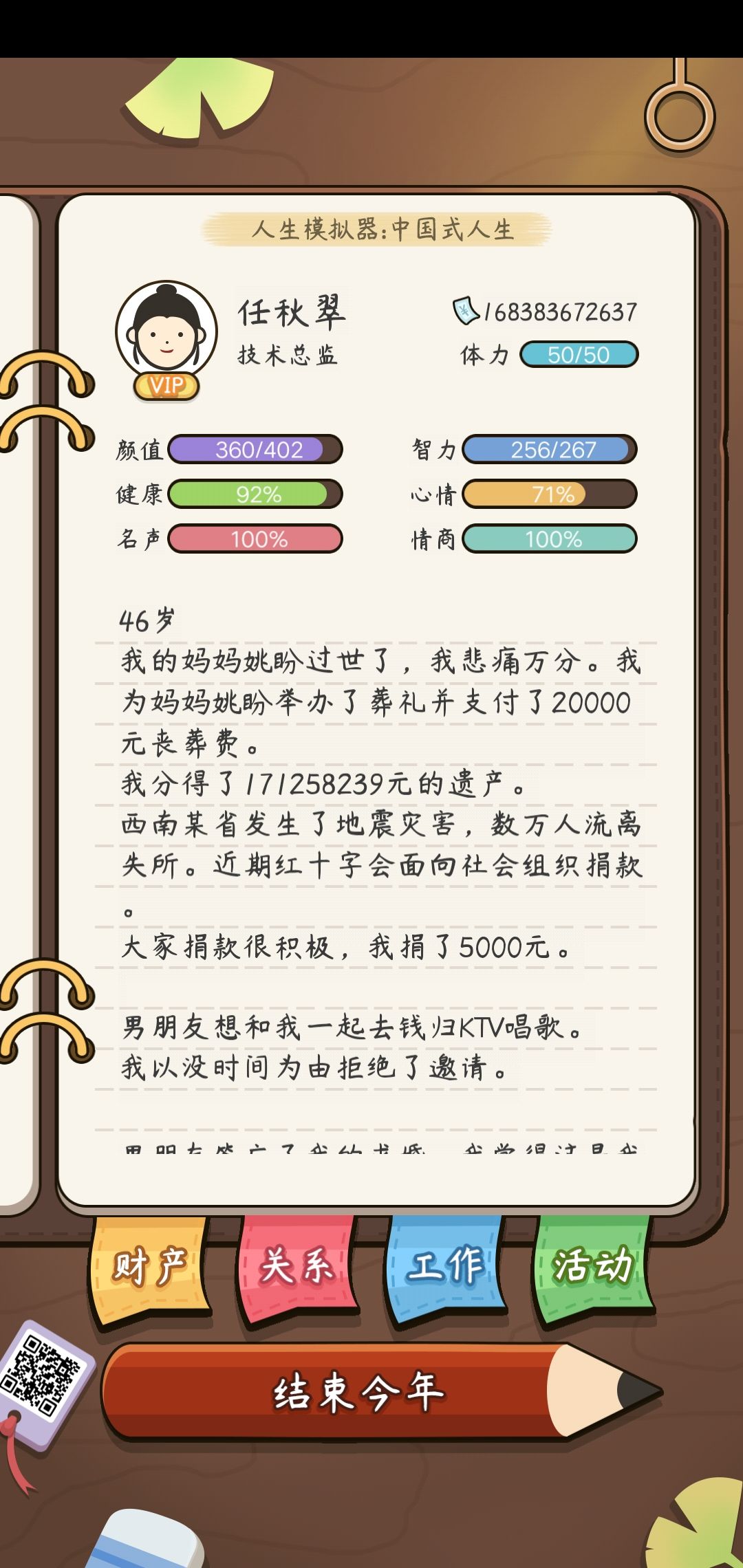 然后高考完根据分数选择你今后职业需要的学校和专业。不要以为属性好就随便选个专业就行了,我刻意培养一代500+300颜值智力的测试了一下,大学读的最差的希东方学校,职业选的程序员,一直到退休也只是个高级程序员,这还是在有高智力的加持下,估计智力一百左右的也就是个中级程序员吧,所以大学选学校和专业很重要。
