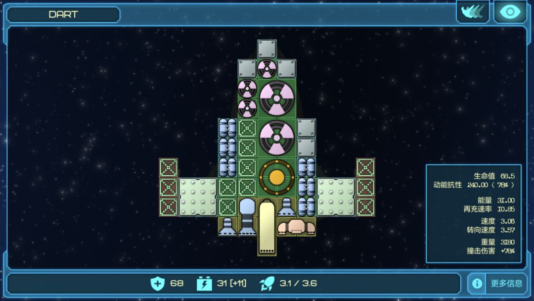 一艘dart能打3-6艘三叉戟,堪称三叉戟杀手。方法是进游戏点一秒后燃器后松手,利用牛一定理,消耗最少能量,保持高速运动。在即将近入三叉戟射程时,船头对准三叉戟运动方向前方三个船身,按住后燃器不松(心中默念:铸我为剑,想着干将23技能也许能提高命中率/笑),不中导弹的话撞死一艘掉不到1/6血。遇到scout mk2,不好撞上,只能自爆了。